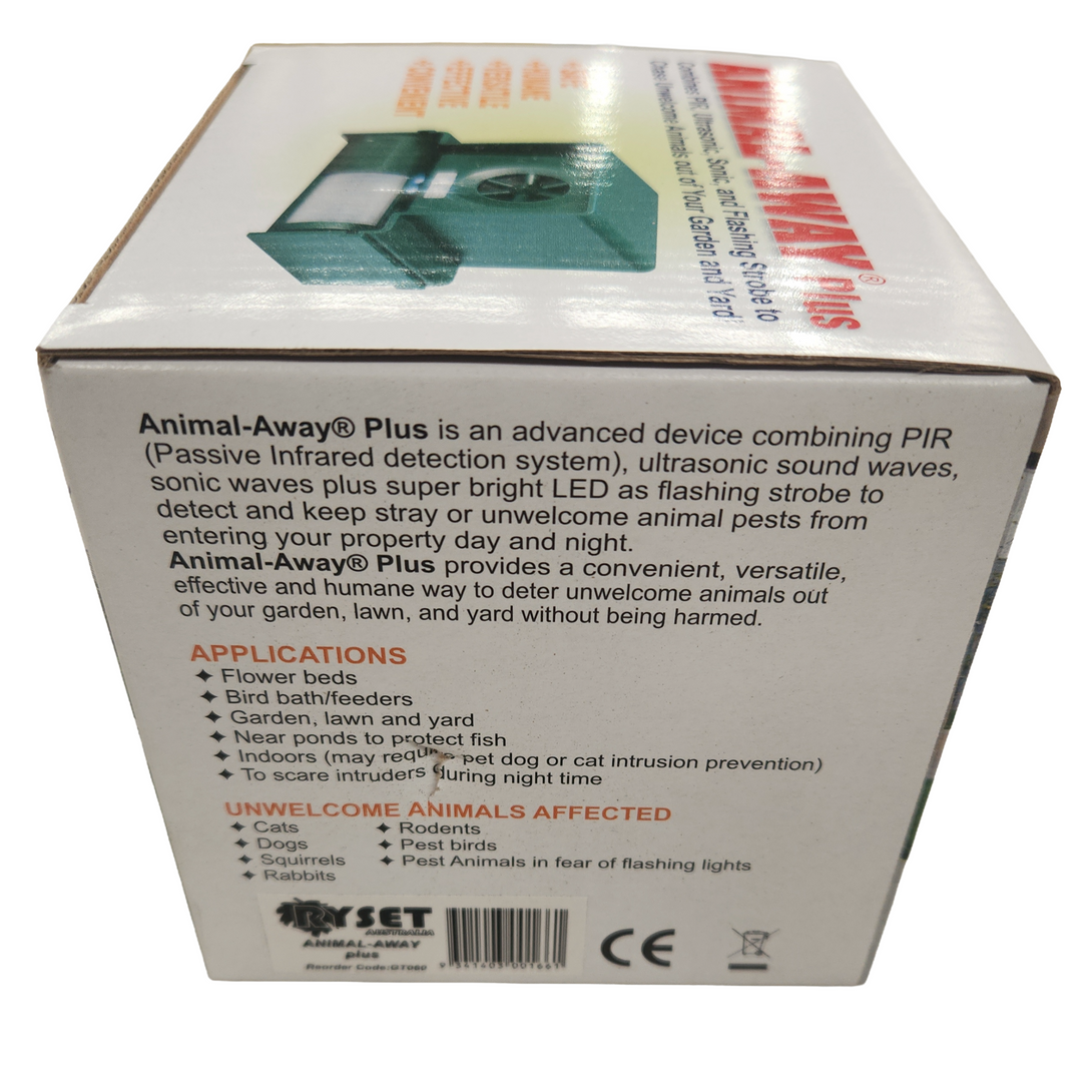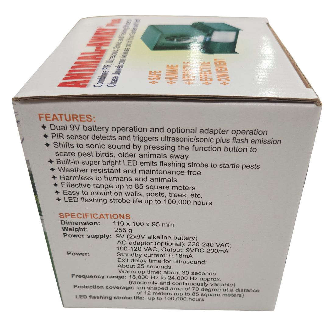 Protect your garden and outdoor spaces with the ANIMAL AWAY PLUS , a smart, motion-activated deterrent designed to frighten off unwanted animals using sound and light. When a pest enters the sensing zone, the device automatically triggers a high-frequency siren—selectable as ultrasonic (inaudible to humans) or sonic (audible)—along with a flashing strobe light for added impact. Battery-powered, weatherproof, and easy to install anywhere, it provides a humane, chemical-free way to safeguard your property from possums, stray pets, birds, and other nuisance animals.