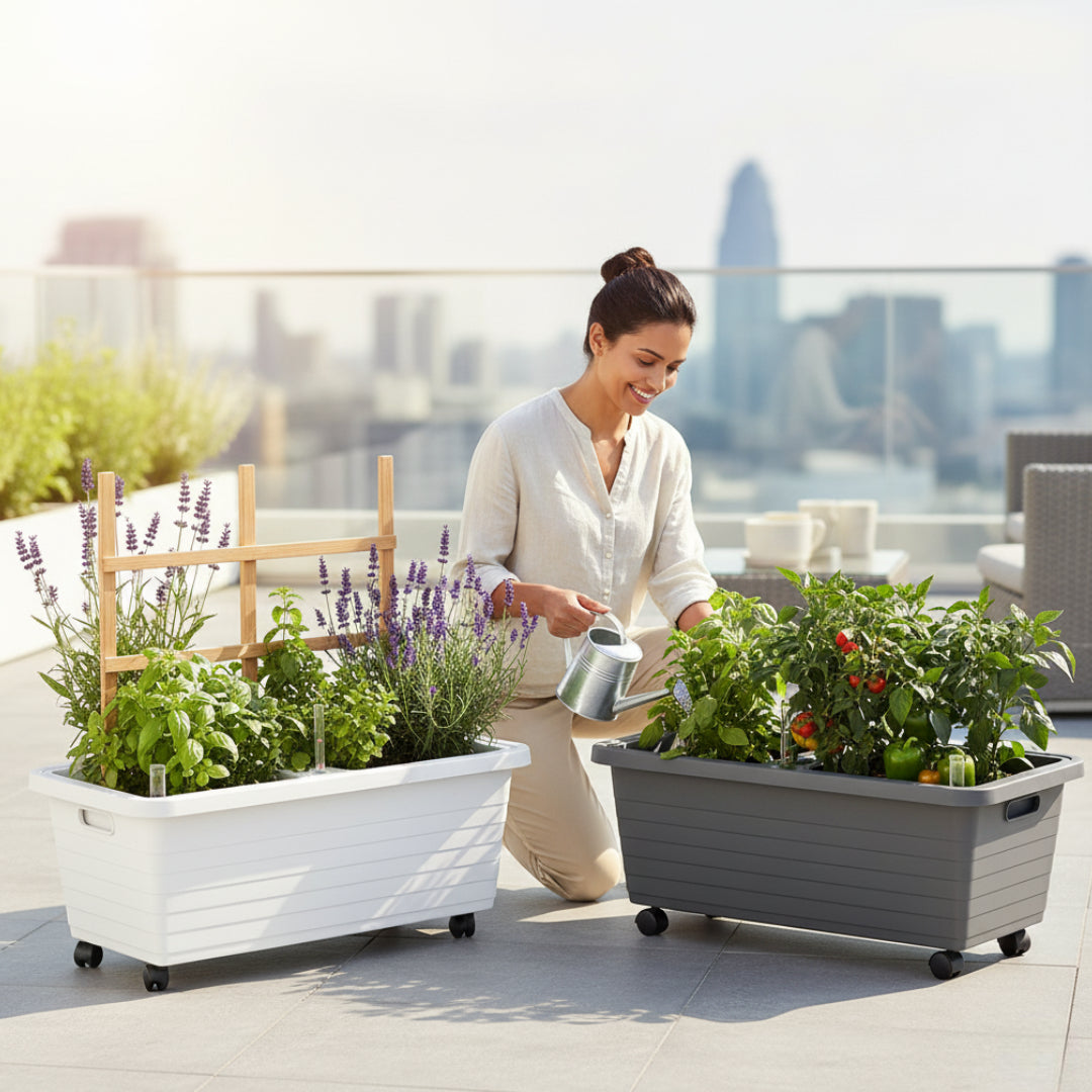 Best For Gardeners on patios, balconies, or decks who need a large-capacity planter with mobility and the ability to separate different plant varieties (e.g., herbs and flowers, or high-water and low-water plants). Ideal for maximizing growing space while minimizing maintenance.