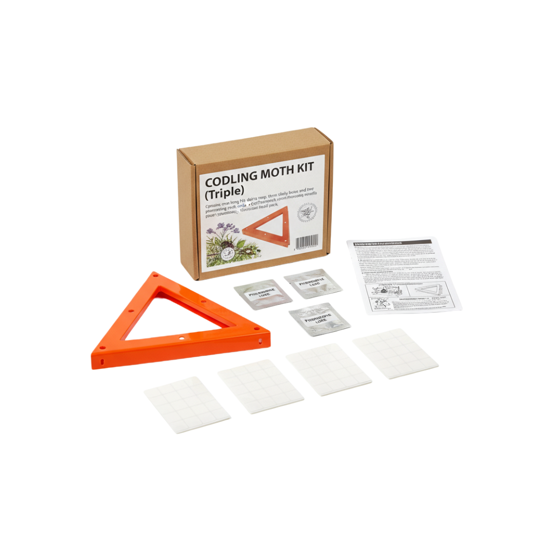 Designed for home orchardists, gardeners, and small-scale growers, the CODLING MOTH KIT (Triple) provides an efficient and targeted way to monitor and reduce codling moth populations in apples, pears, and related fruit trees. This triple pack includes a long-life delta trap, three sticky bases, and three pheromone lures specifically formulated to attract male Cydia pomonella (codling moth). By intercepting male moths, the kit helps break the breeding cycle and assists in assessing pest pressure throughout the season.