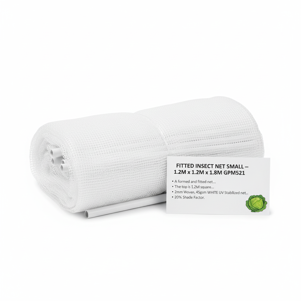This Small Fitted Insect Net is purpose-designed to provide instant, reliable protection for raised garden beds, veggie patches, and taller plants such as tomatoes. With a formed, structured shape measuring 1.2m x 1.2m at the base and 1.8m high, it encloses crops fully—keeping out a wide range of flying pests including cabbage moth, fruit fly, and codling moth. The fully closed sides ensure complete coverage, and easy access is achieved simply by lifting the net off the frame or bed.