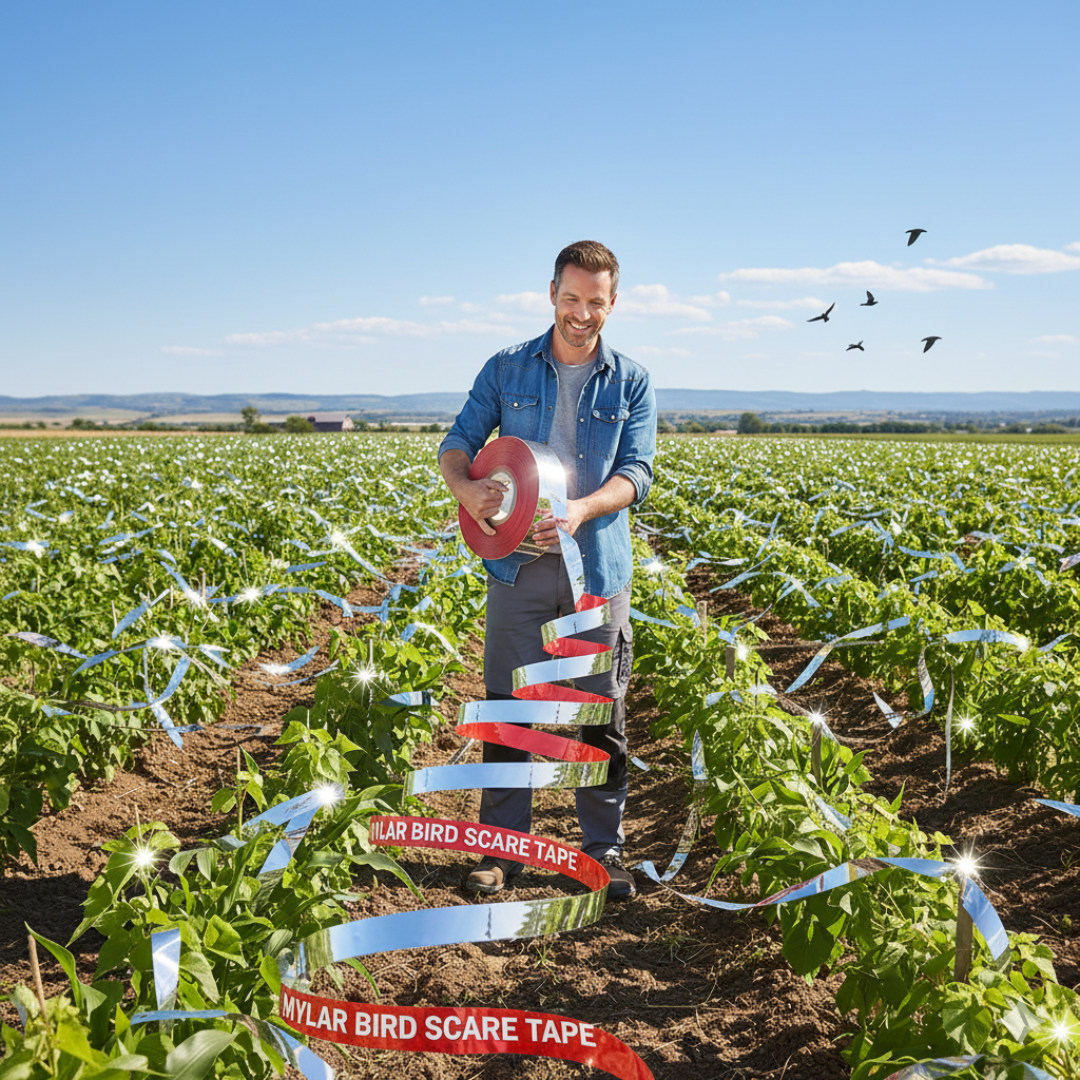 This Mylar Bird Scare Tape is a simple, effective, and non-toxic way to deter birds from orchards, vineyards, vegetable gardens, and property boundaries. Made from highly reflective aluminium chrome/red Mylar, the tape flashes brightly in sunlight and creates movement in the wind—producing visual signals that confuse and repel problem birds without causing them harm.