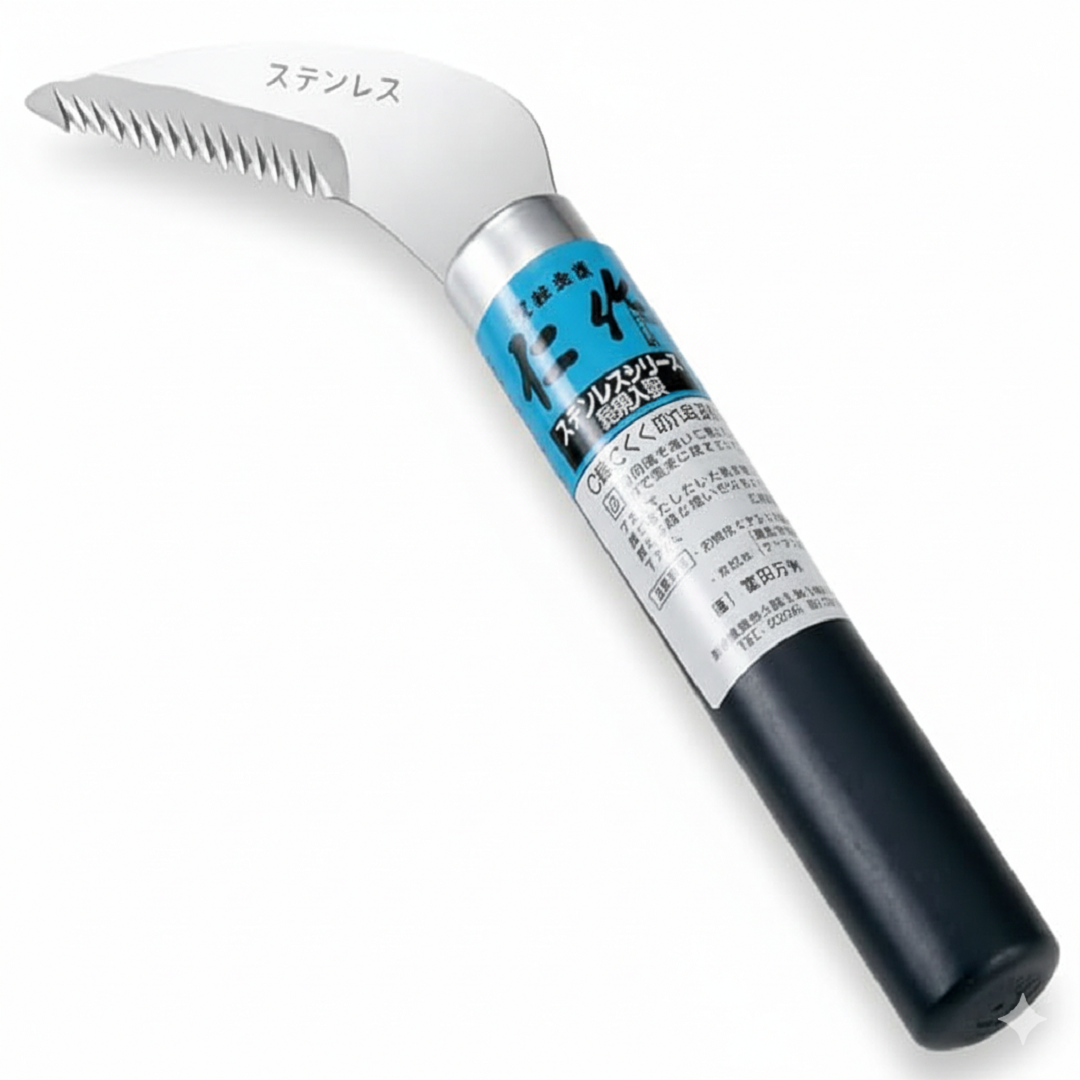 The **Nisaku Stainless Steel Sickle** is a durable, multi-purpose tool perfected through traditional Japanese craftsmanship. Designed primarily as an effective **weed remover**, the blade is constructed from **fully hardened stainless steel (HRC54°)**, ensuring exceptional edge retention, resistance to rust, and long service life. The entire blade can be **easily resharpened**, guaranteeing peak cutting performance season after season. The strong blade design is ideal for severing tough weeds, clearing grass, and cutting through small roots. The sickle features a comfortable **natural wood handle** finished with a distinctive dark blue melamine paint. This robust and hygienic tool is proudly **Made in Japan**.