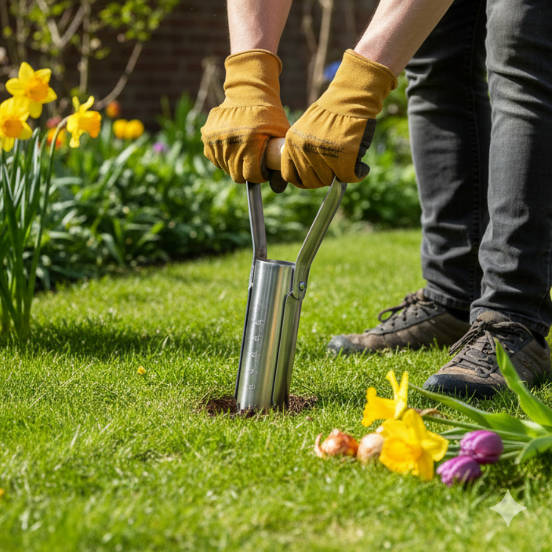 This durable tool features a rust-resistant, polished stainless steel head with a 60mm-diameter core, ideal for planting tulips, daffodils, alliums, and other large bulbs. The head is designed with a serrated rim that cleanly and easily cuts through soil and turf, reducing the effort needed to plant.