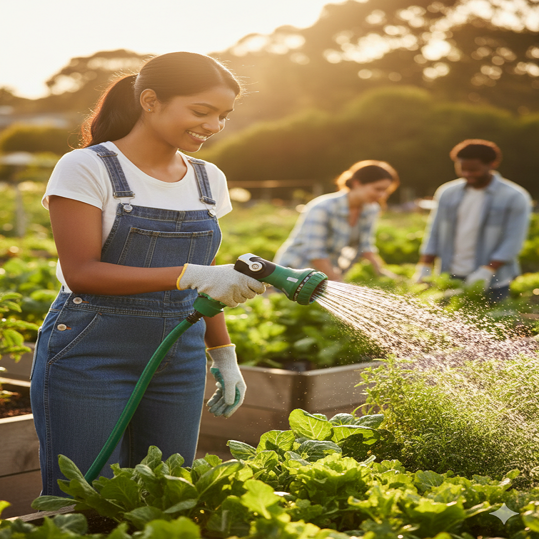 Watering varied plant types, including hanging baskets, potted plants, and flowerbeds.