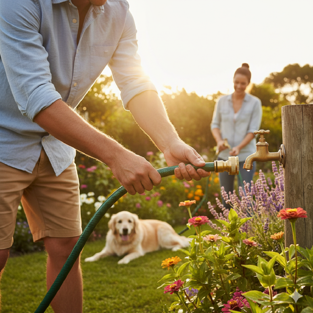 Establishing the main water source for a high-flow 19mm hose used for irrigation or high-volume cleaning.