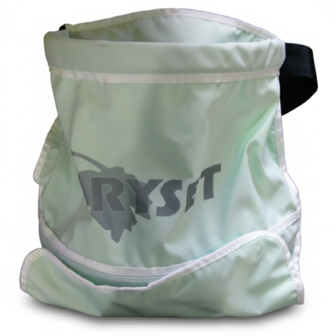 The **Ryset Olive Waist Bag** is a low-cost, efficient solution designed for hands-free harvesting of olives, small fruits, and nuts. This bag is constructed from durable **poly canvas**, offering a lightweight yet sturdy container for your harvest. It features a convenient **single waist strap** to keep the bag securely positioned around the picker's body, freeing both hands for continuous work. The most efficient feature is the **hook & loop sealed bottom exit chute**, which allows the collected harvest to be quickly and easily emptied from the bottom directly into a larger container. With a practical capacity of **0.3 bushel**, this bag is an essential tool for streamlining small-scale harvests. Proudly **Made in Australia**.