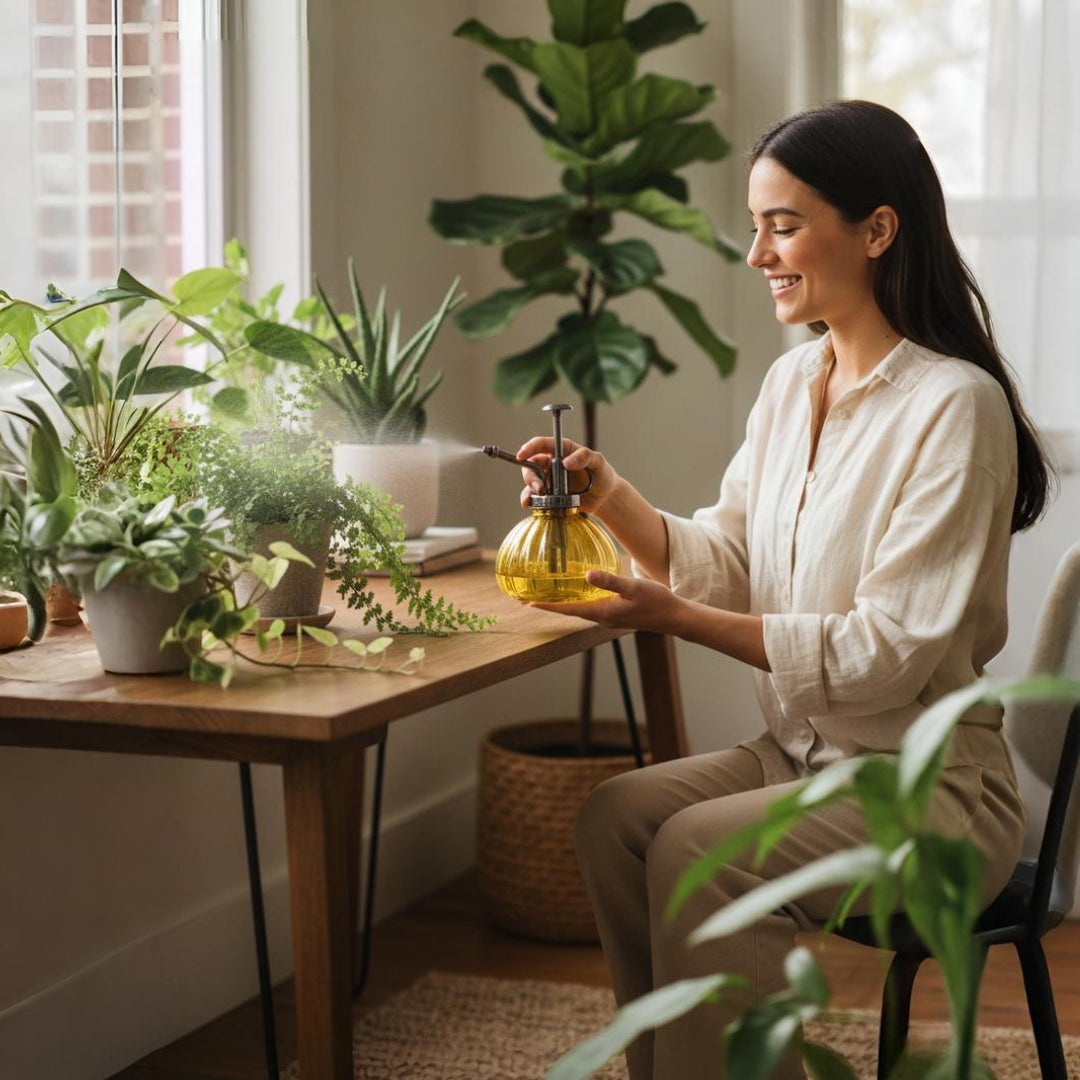 Misting indoor ornamental plants like ferns, orchids, and tropical houseplants.