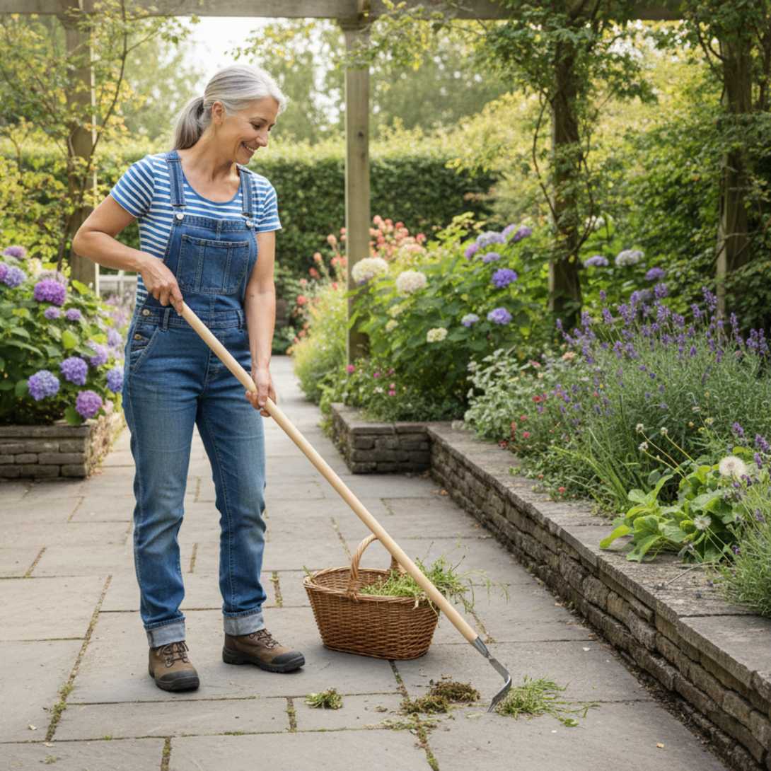 Precisely removing grass and weeds from the cracks and joins between patio stones, pavers, and stepping areas.