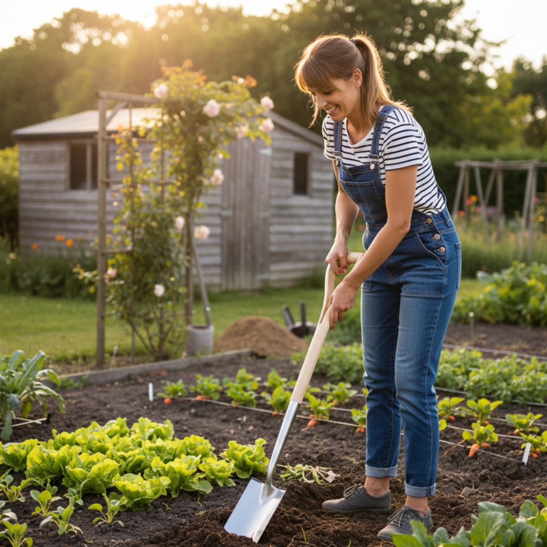 Digging planting holes and turning soil in deep raised garden beds and vegetable patches.