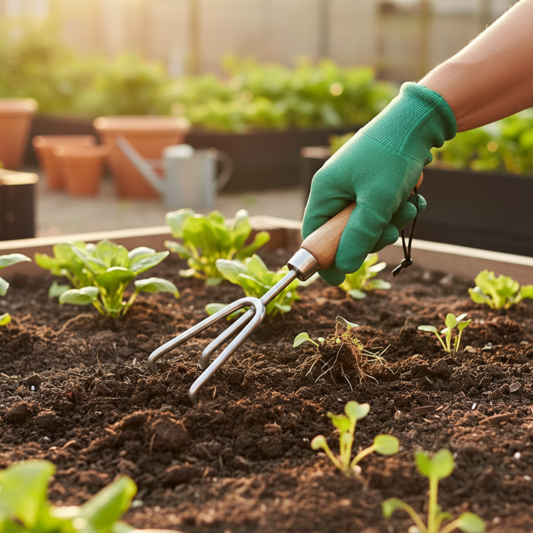 Loosening and aerating the soil surface in vegetable patches and flower beds before planting or seeding.