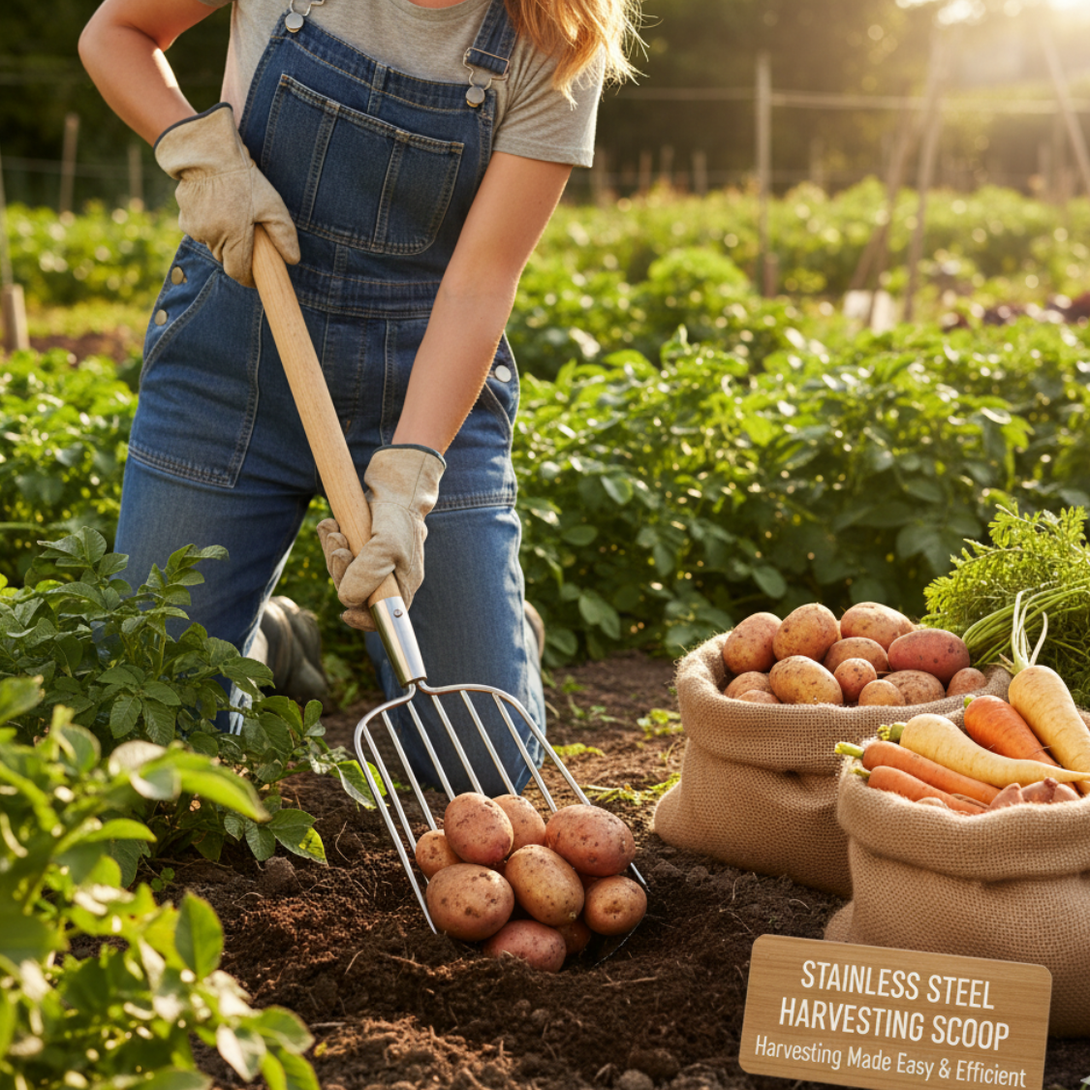 Harvesting potatoes and root vegetables often involves bending and heavy digging, risking strain and damaging your crop with a sharp spade. The Stainless Steel Harvesting Scoop solves both problems instantly. Featuring an extended 600mm handle for superior reach and a specially designed, polished scoop head, this tool allows you to gently loosen, lift, and retrieve root crops while standing comfortably. It’s the essential tool for a damage-free, effortless harvest.