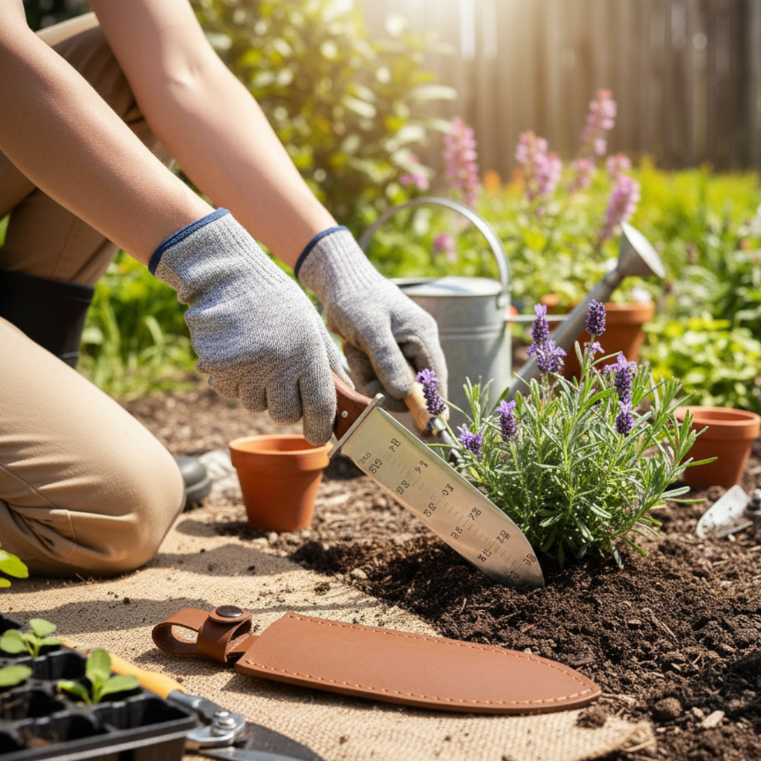 Precisely digging planting holes and scooping soil for container gardening and transplanting.