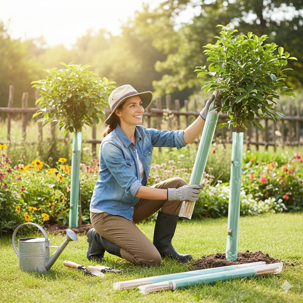 Providing critical protection for newly planted small fruit trees, citrus, and berry standards in a home orchard setup.